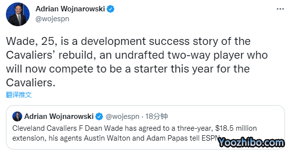 JRS直播09月24日,据espn名记沃纳罗斯基报道,经纪人透露,骑士前锋迪恩-韦德已经同意与球队续签3年1850万美元的新合同;25岁的迪恩-韦德演绎励志故事,从落选秀双向合同球员到成为骑士重建的一部分,woj还透露他今年将会竞争球队的首发位置。