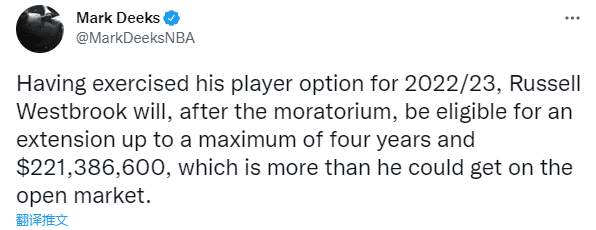 JRS直播06月30日讯 ,据NBA分析师Mark Deeks报道,在执行下赛季球员选项后,威少将有资格与湖人签下4年2.21亿美元的顶薪提前续约合同,这比他在自由市场上能获得的合同更大;威少该合同最后一年的年薪将达到6127万美元,但是考虑到届时工资帽也将上涨,这份年薪的大小暂时无法衡量。
