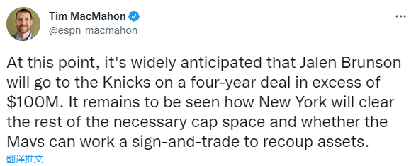 JRS直播讯 北京时间6月29日,东契奇的冲冠帮手布伦森可能离队,据名记Tim MacMahon报道,预计尼克斯将给布伦森一份4年超1亿美元的大合同,联盟内部人士普遍认为布伦森会加盟尼克斯而不是留在独行侠;尼克斯不仅给大合同,还承诺首发控卫,正清理薪资空间疯抢布伦森。
