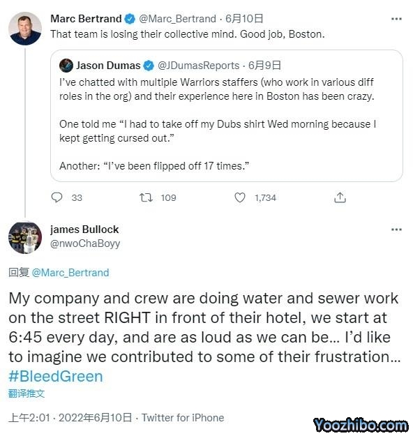 JRS直播06月12日讯 勇士在波士顿的客场之旅打得十分艰难,凭借库里的超神表现,勇士和凯尔特人打成2-2平;除了场上遭遇盘外招之后,绿军球迷自曝公司要求他们在早上修水管,在勇士下榻的酒店前制造噪音骚扰球员休息,库里和汤普森可能是受影响最大的两人。