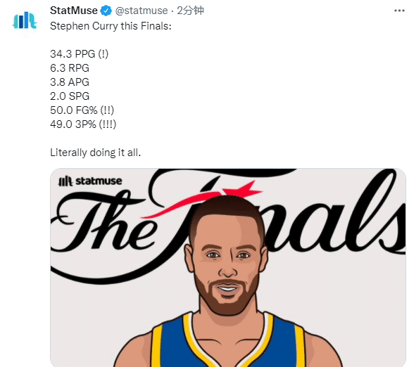 总决赛四场打完,库里场均狂砍34.3分6.3篮板3.8助攻2抢断,投篮命中率为50%,三分命中率为49%;目前勇士2-2凯尔特人,若勇士最终夺冠,库里很有希望夺得生涯第一座FMVP。
