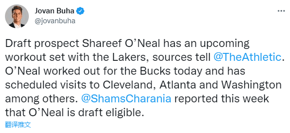 JRS直播06月10日讯 据洛杉矶记者Jovan Buha报道,消息人士透露,NBA名宿奥尼尔之子沙里夫-奥尼尔计划参加湖人试训,今日沙里夫将为雄鹿试训,并计划前往克利夫兰、亚特兰大和华盛顿等地参加试训。