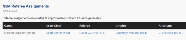 JRS直播06月09日讯 ,NBA官方公布了总决赛G3的裁判名单,他们分别是48号裁判斯科特-福斯特,16号裁判大卫-古斯里,61号裁判 考特尼-科克兰德,替补裁判是74号裁判柯蒂斯-布莱尔。
