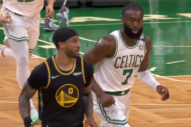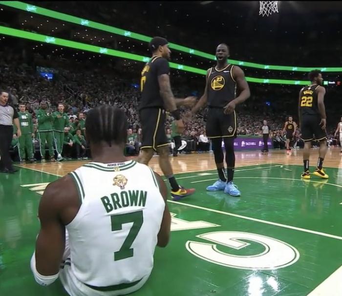 JRS直播06月09日讯 ,勇士和凯尔特人总决赛G3正式开打,杰伦-布朗第一节再次大爆发,单节9投6中、三分4中3轰下17分5篮板3助攻,晃倒小佩顿太狠,惨遭格林大帽后被喷垃圾话挑衅,绿军球迷为布朗抱不平,全场怒喷格林垃圾。