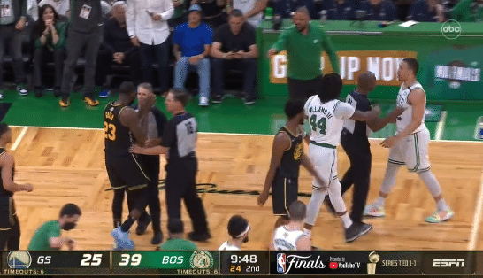 JRS直播06月09日讯 ,勇士和凯尔特人总决赛G3,第二节场上险些发生冲突,格林和格威互喷垃圾话,所幸及时被劝阻拉开,双方都没有吃到技术犯规,这比赛打得真是火药味十足。