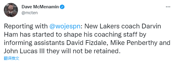 据ESPN名记大卫-麦克马洪和沃纳罗斯基联合报道,湖人新任主帅哈姆已经开始调整自己的教练组,他通知球队助教大卫-菲兹戴尔、迈克-彭勃西和约翰-卢卡斯三世,他们三人都将不会留用;根据之前的报道,爵士小老板韦德有意让菲尔戴尔担任爵士新帅一职。