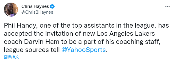 据名记Chris Haynes报道,NBA顶级助教菲尔-汉迪接受湖人新帅哈姆邀请留队,成为后者教练团队中的一员。