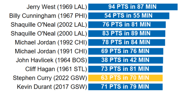 按每分钟得分来排名(至少出战30分钟),总决赛历史前两场得分效率的前10位,库里今年的前两战表现(70分钟得到63分)能排在第9位,正好力压2017年总决赛的杜兰特(前两战79分钟得到71分)。