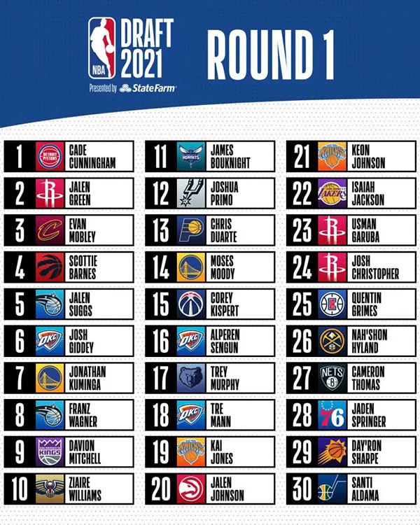 JRS直播讯 2021年3月30日,NBA公布,2021年NBA选秀大会将在北京时间2021年7月30日在篮网主场巴克莱中心举行,于当日8:00正式开始。NBA还公布了关于2021年NBA选秀大会其它事宜的日期。那么2021年NBA选秀大会首轮被选中的球员有哪些呢?跟随小编一起来了解下吧!