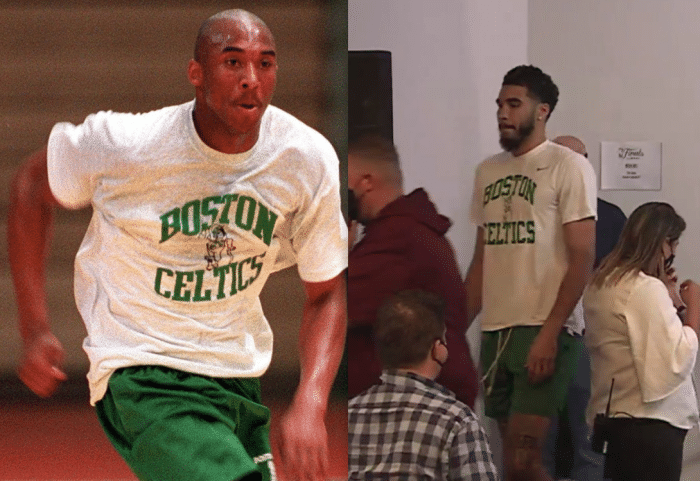 JRS直播06月05日讯 ,凯尔特人备战总决赛G2,塔图姆再次向科比致敬,据绿军随队记者Taylor Snow报道,塔图姆今日塔图姆身穿了一件科比在1996年试训绿军时的同款训练T恤,他用这样的方式向偶像致敬。