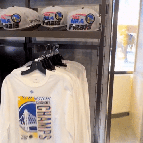 通过去到现场观看的球迷视角,可以看到在NBA总决赛G1开始前,俱乐部官方球迷商店人挤人,非常多,销售的是勇士西部冠军的周边产品和NBA总决赛的物品,其中主要是T恤、帽子、篮球、饰品等等。虽然每一样东西都不大,但因为是俱乐部官方产品,价格并不便宜。