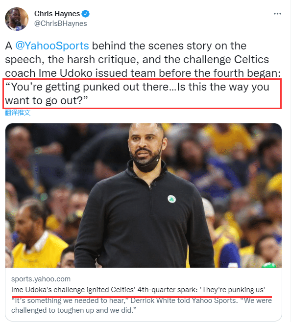 总决赛G1三节打完,凯尔特人80-92落后12分,为了绿军突然士气大振并且攻防两端打爆勇士,据名记克里斯-海耶斯报道,绿军主帅乌度卡在第四节前的激情演讲和批评点燃了全队,当时乌帅冲着众球员喊话:你们在场上被欺负了,他们正在打我们,难道这就是你们留在场上的方式吗?这不是我们,我们至少要给我们自己一个机会。