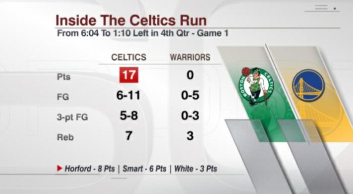 总决赛G1,凯尔特人全队投进21记三分导演15分大逆转,末节40-16分狂赢24分创历史总决赛末节最大分差,凯尔特人终结勇士主场9连胜;绿军疯狂一战,从第四节6分04秒到1分10秒,5分钟打出17-0超级攻势,这是NBA总决赛第四节第二大攻击波,在这期间,投篮11投6中、三分8中5。