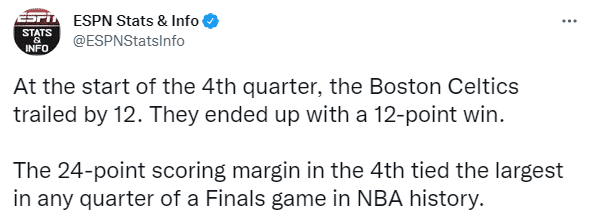 凯尔特人成为 NBA历史上第一支落后两位数进入末节最终在总决赛赢下两位数的球队;三节打完落后12分,最终赢勇士12分。
