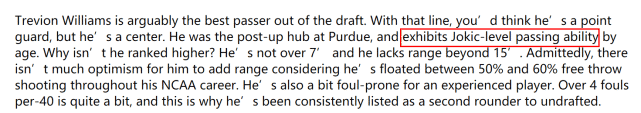 作为一名大个子球员,威廉姆斯最大的优势是他令人难以置信的传球能力。NBA选秀专家迈克-加西亚表示,威廉姆斯可以说是本届新秀中最好的传球手,听到这个描述,你可能以为他是一个控卫,但实际上他是内线球员。他在普渡大学还打过中锋,他在同年龄球员中拥有堪比约基奇的传球能力。那为什么他的预测顺位不高?因为他的身高没有超过7英尺,而且中远投投射能力欠佳。犯规也偏多, 每40分钟会出现超过4次犯规。现在来看,威廉姆斯有可能在二轮末被选中,也有可能成为落选秀。