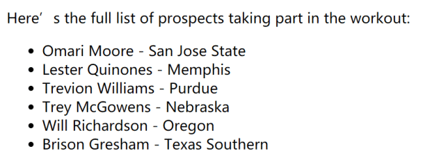 在今天的选秀试训中,身穿3号球衣的特雷韦恩-威廉姆斯是最受关注的一位,他有可能在第二轮被选中。大四赛季, 威廉姆斯场均出场20.1分钟,场均贡献12分7.4篮板3助攻,是一个身高2米08,体重120公斤的内线球员。他是Big Ten赛区的年度最佳第六人。而他在大三赛季打主力时,场均能贡献15.5分8.1篮板2.3助攻。