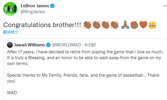 JRS直播06月01日讯 ,勒布朗-詹姆斯前队友贾瓦德-威廉姆斯在社交媒体上宣布正式退役,老詹本人发推祝贺:恭喜我的兄弟(4个鼓掌+拳头+爱心+王冠表情)。