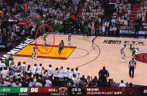 终场前1分07秒,洛瑞在反击过程中,先迈开脚步随后再运球,这明显是一个走步违例。而裁判没有做出吹罚,洛瑞一条龙反击得手,帮助热火追到只差5分。而终场前23.7秒,凯尔特人98-96领先并且握有球权。此时巴特勒在篮下防守三秒违例,但裁判依然没有吹罚。随后斯玛特强突篮下不中,但好在巴特勒持球反击三分不中。