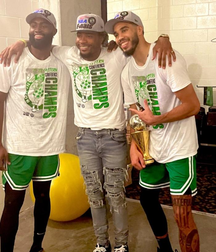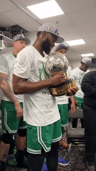 杰伦-布朗抱着东部冠军奖杯。