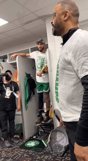 凯尔特人晋级总决赛赛后,全队在更衣室庆祝,绿军主帅乌度卡发表讲话时,全队突然朝他泼水庆祝,多名球员爆粗口,现场氛围太热闹;之后乌度卡继续讲话,塔图姆抱着东决MVP奖杯,全程站在椅子上抱着奖杯不撒手,全程咧嘴大笑太开心。
