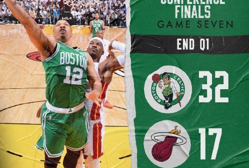 JRS直播05月30日讯 ,NBA东部决赛第7场打响。结果此役开场,客场作战的凯尔特人便打出了非常猛烈的进攻输出,20-7梦幻开局。随后凯尔特人继续扩大优势,首节结束已经32-17领先热火15分。对于热火来说,他们再度被逼入绝境。