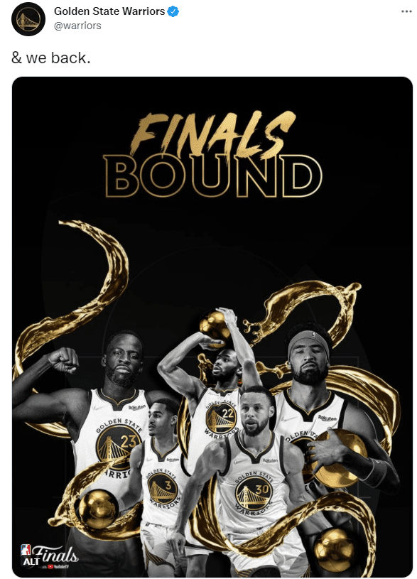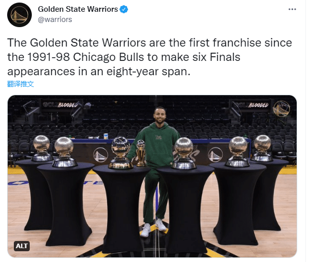 JRS直播05月28日讯 勇士西决4-1淘汰独行侠从而夺得西部冠军,时隔3年重返总决赛,8年6进总决赛创纪录;勇士官方晒出库里霸气合影7座奖杯的照片,配文写道:勇士成为1991-98公牛王朝之后第一支8年6次晋级总决赛的球队;勇士官推还霸气喊话:我们回来了!
