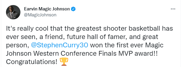 湖人名宿魔术师恭喜库里,发推写道:真的很酷,有史以来最伟大的投手,未来的名人堂成员和伟大的人,恭喜库里夺得第一个西决MVP奖杯。