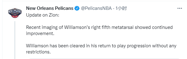 JRS直播05月27日讯 ,新奥尔良鹈鹕官方宣布锡安的伤势已经无碍,解除活动限制并完全恢复篮球相关的活动,官方声明:最近的影像显示,锡安右脚第五跖骨的状况持续改善,他已经可以没有任何限制地重返球场。