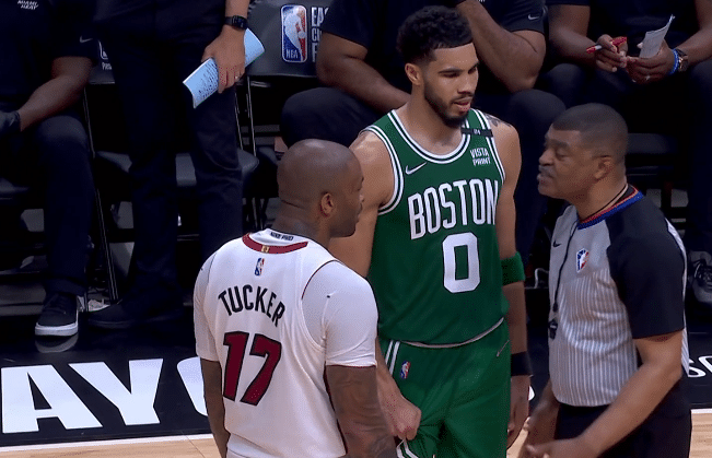 下半场,凯尔特人第三节突然哑火,长达7分钟没有运动战进球,被热火打出22-2的超级攻势,瞬间落后到12分,期间塔图姆连续两次失误,被巴特勒抢断反击得分;之后热火断电,绿军9-2反扑,塔图姆多次站上罚球线,期间他和塔克发生肢体接触,激烈卡位,裁判警告他们,以防事态恶化。