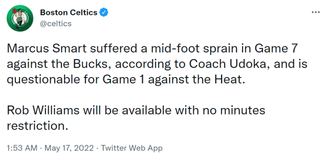 消息人士透露,斯马特今天接受了核磁共振检查,显示没问题,他将在明天赛前测试自己的右脚。“他摔得很惨,中足扭伤,现在非常酸痛,”绿军主帅乌度卡说道,“我们将全天为他进行治疗,目前他是出战成疑(questionable,50%上场可能)的状态。”斯马特在抢七大胜雄鹿的比赛中受伤。
