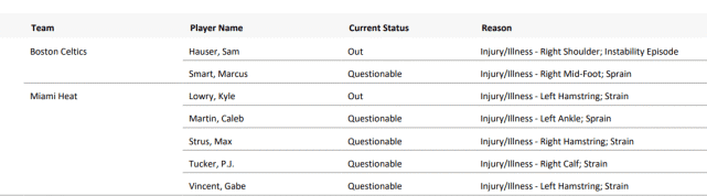 JRS直播05月17日讯 ,塔图姆率领凯尔特人飞赴迈阿密,绿军官方晒出了球员们的登机照。两队的伤病情况也公布了,凯尔特人的斯马特因右中足扭伤出战成疑(上场可能50%),罗伯特-威廉姆斯预计复出,并没有上场时间限制,豪瑟继续因肩伤缺阵。热火一方的洛瑞(左腿筋拉伤)没有参加今天的训练,已经确定缺席G1的比赛,另外,凯勒布-马丁(左踝扭伤)、斯特鲁斯(右腿筋拉伤)、塔克(右腿拉伤)和文森特(左腿筋拉伤)都是出战成疑(上场可能50%)的状态。