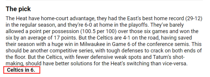 对于今年的分区决赛,NBA官网预测勇士4-2淘汰独行侠,凯尔特人4-2淘汰热火,换句话说,官网预测勇士和凯尔特人将会师总决赛从而争夺总冠军。