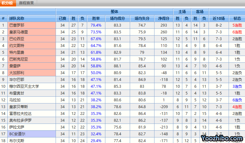JRS直播05月16日讯 本赛季西班牙篮球甲级联赛常规赛正式落下帷幕,巴塞罗那27胜7负排名第一,力压皇家马德里的25胜9负,一共18支球队,前8名晋级到季后赛,最后一名垫底的球队将会降级。很遗憾,本赛季西甲垫底的球队是布尔戈斯,他们战绩定格在10胜24负,排名倒数第一,降级到乙级联赛。