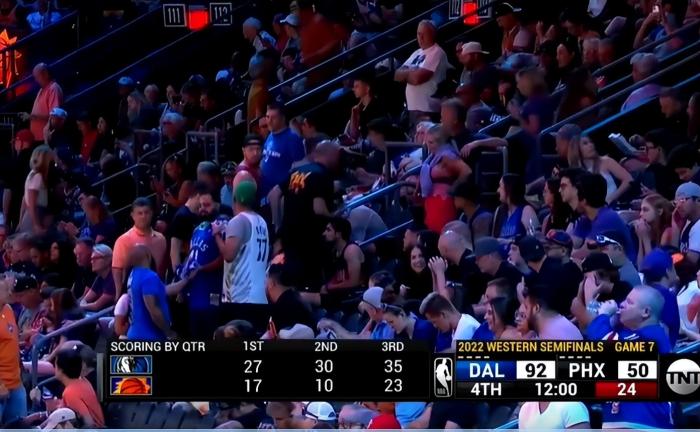 JRS直播05月16日讯 ,NBA西部半决赛抢七太阳主场对阵独行侠。结果这场备受期待的抢七大战,常规赛联盟第一的太阳遭遇了近乎疯狂一般的溃败!半场,太阳27-57便落后30分,东契奇1人的半场得分等于太阳全队。三节结束,太阳更是50-92落后整整42分!太阳从主帅到球员,再到看台上的观众,都面露绝望。