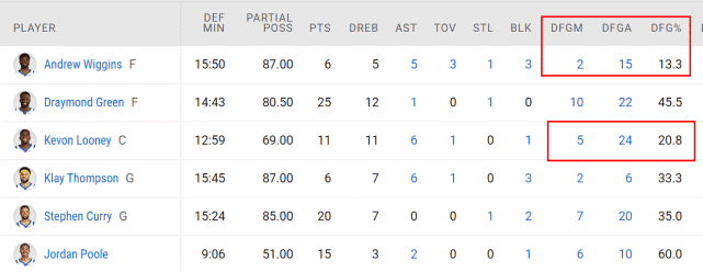 JRS直播05月15日讯 勇士在G6一战中110-96击败灰熊,以4-2的总比分晋级。96分也是灰熊在这轮系列赛中的单场最低分。NBA官方公布了勇士和灰熊G6的防守数据,维金斯和卢尼在防守端表现强悍,两人合计只让对手39投7中,命中率不到18%!