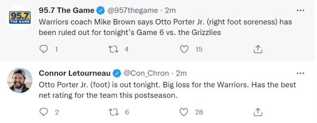 JRS直播05月14日讯 ,勇士代理主教练迈克-布朗宣布,奥托-波特因右脚酸痛将不会出战今天勇士vs灰熊G6的比赛。勇士跟队记者Connor Letourneau表示,勇士遭遇重大损失,波特的净效率值在季后赛排名全队第一。