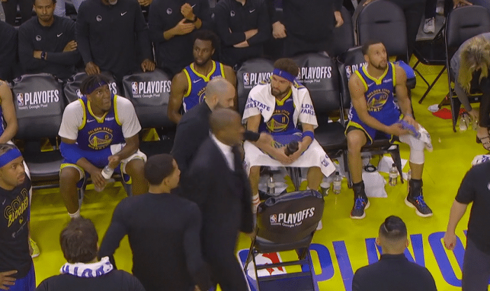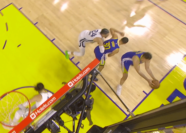 暂停回来琼斯抢断三分命中,库里挑篮不中,杰克逊反击抛投命中,贝恩反击造成李阻挡犯规,勇士挑战失败,贝恩两罚全中,格林上篮命中止血,在一次抢篮板的过程,布鲁克斯先是夹住库里手臂,随后又将库里直接推倒在了地上,裁判吹罚犯规,随后克莱替库里出头与鲁克斯发生小争执,两人双双领到技术犯规,最终裁判给了布鲁克斯一级恶意犯规。