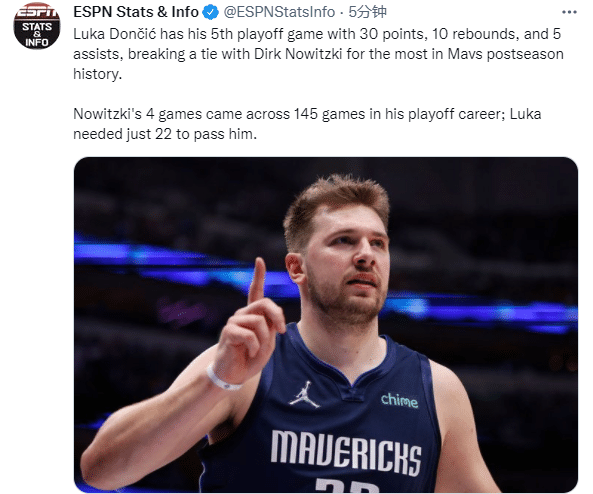 东契奇第5次单场30+10+5超越诺维斯基成独行侠队史第一人,诺天王145场季后赛仅4次达成如此数据,东契奇仅用了22场。