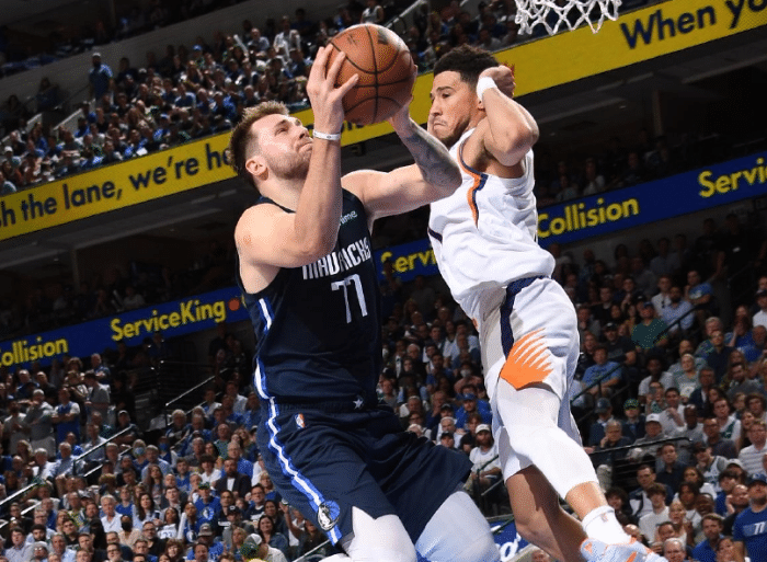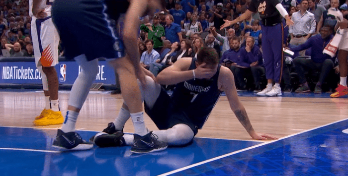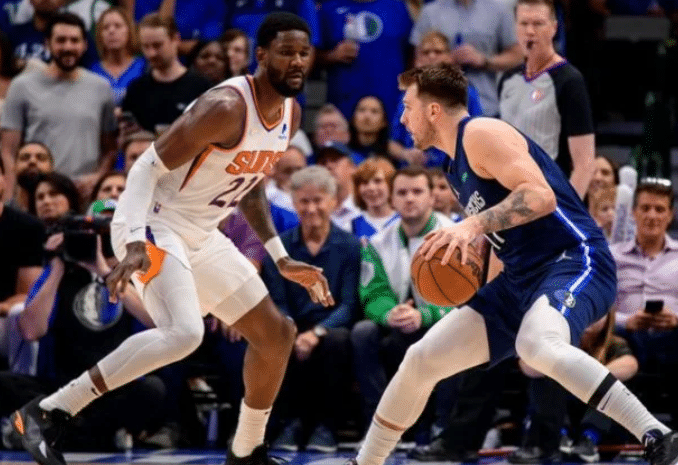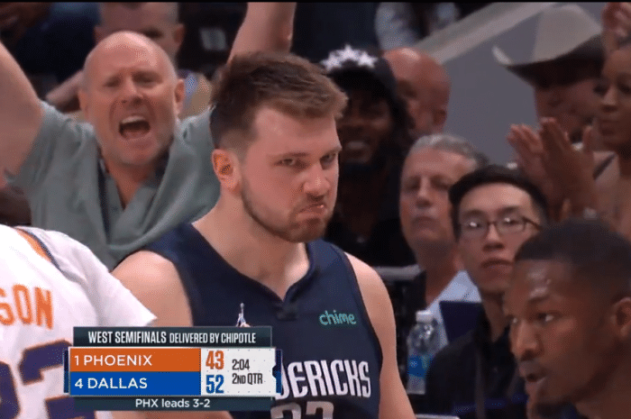 第二节,东契奇休息时在场边蹬自行车热身,一度因膝盖疼痛而返回更衣室;7分01秒东契奇重新上场,强硬突破并且造布克犯规打成2+1,此时卢卡怒瞪布克,单挑艾顿再中三分,此时东契奇露出发狠表情霸气庆祝,在东契奇的带领下,独行侠打出19-4攻势,半场打完独行侠60-45领先太阳15分。