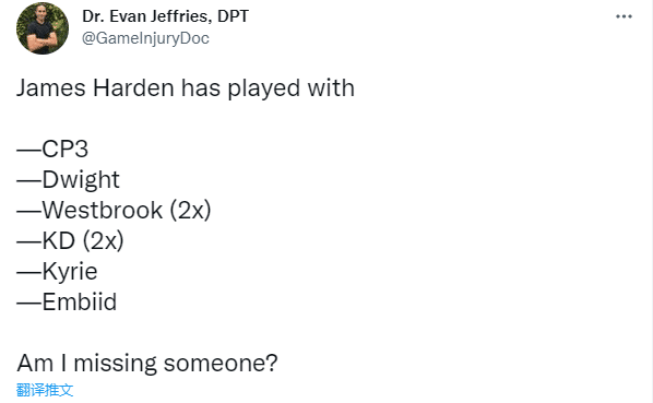 职业生涯至今,哈登联手的过的球星有杜兰特(2次)、威少(2次)、恩比德、保罗、霍华德和欧文,联手过这么多球星却从未夺冠;本赛季,哈登赛季中期申请离开篮网,如愿加盟76人,最终却止步东部半决赛;G6赛后,哈登表示想要继续留在76人,明年再次冲击总冠军。