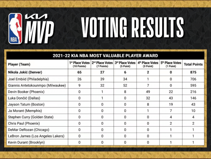 约基奇的实力毋庸置疑,本赛季常规赛场均出战33.5分钟,得到27.1分13.8篮板7.9助攻1.5抢断,投篮命中率高达58.3%。本赛季掘金队缺兵少将,贾马尔-穆雷和小波特双双赛季报销,掘金队完全靠着约基奇一人在苦苦支撑。最终约基奇在大多数人不看好的情况下,将掘金队带到了西部第六的位置,可以说相当的难能可贵,他完全有理由当选MVP。他当选MVP也算是对他本赛季辛苦付出的肯定,他成为了NBA历史上第一个完成连庄MVP的二轮秀。