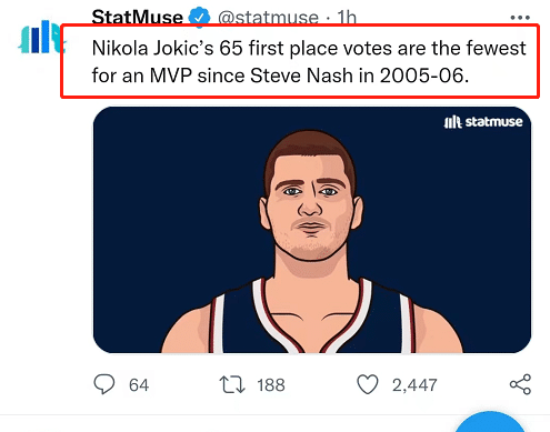 JRS直播05月12日讯 约基奇连庄MVP却打破一尴尬纪录,国外网友嘲讽:媒体把他吹得太过头了!NBA季后赛打得如火如荼,常规赛MVP奖项在近日正式公布,掘金队的尼古拉-约基奇成功蝉联常规赛MVP,成为了NBA历史上第13位连续两年拿到常规赛MVP奖项的球员。拿到MVP本该是一件皆大欢喜的事,可约基奇却因此陷入了尴尬。在本赛季的常规赛票选中,约基奇仅拿到65票首选票,是自05-06赛季纳什当选MVP以来得票数最低的球员。