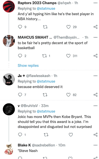 本赛季的MVP投票结果也引发了国外网友的议论,国外网友对约基奇的评价褒贬不一。有人认为,约基奇完全是被包装炒作出来的球员,他的名气大于实力,拿到65票合情合理;也有网友对约基奇表示支持,认为约基奇是一名十分不错的球员,他值得受到大家的尊重和肯定;也有网友对MVP奖项的含金量提出质疑,表示不能理解为何约基奇的MVP比科比还要多,MVP这个奖项就是个笑话,不管谁当选MVP都不会感到惊讶。