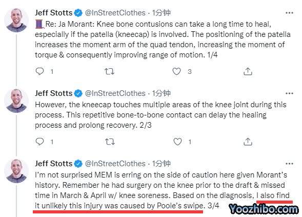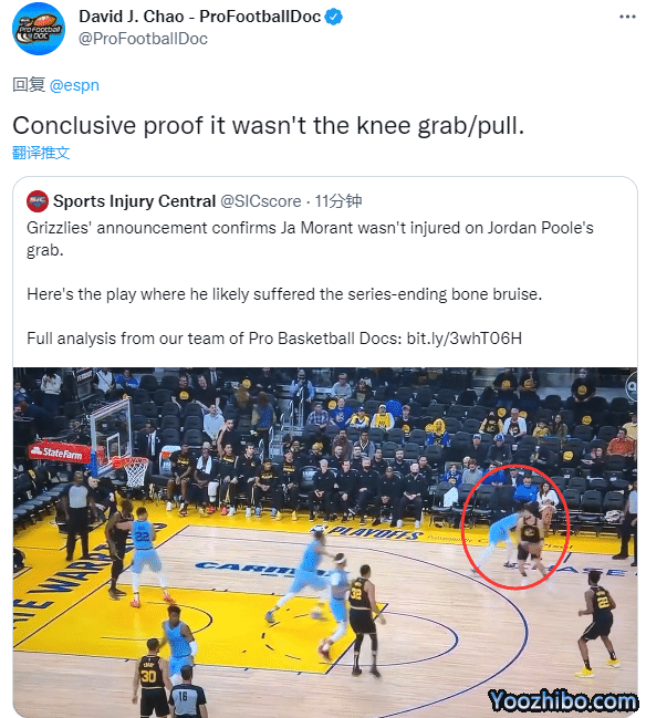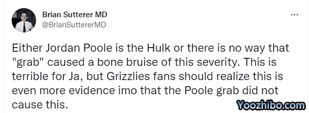 医学专家Jeff Stotts分析莫兰特的伤情,表示膝盖骨挫伤需要很长的时间才能愈合,还表示这种伤病不太可能是普尔拉拽导致的;另外一名医学专家Brian sutterer发推写道:除非普尔是绿巨人,否则拉拽不可能造成如此严重的骨挫伤。这对莫兰特来说很糟糕,但灰熊队的球迷应该意识到,这更能证明普尔的抢球并不是造成这种情况的原因。