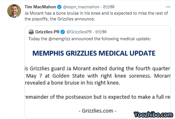 JRS直播05月11日讯 ,灰熊官方公布莫兰特的核磁检查结果,伤情确诊为右膝骨挫伤,大概率缺席季后赛的剩余赛程,预计将会赛季报销;灰熊大比分1-3落后,莫兰特伤停,再输一场就将被勇士淘汰出局。