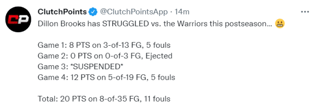 clutchpoints随后吐槽了狄龙的系列赛的糟糕表现,写道:“他在今年季后赛对勇士的系列赛里太挣扎了……“