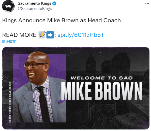 JRS直播05月10日讯 ,国王队新帅正式确定,国王官宣正式任命迈克-布朗成为球队主教练,晒照并且发推:欢迎来到萨克拉门托;国王总经理发声,勇士主帅科尔直言勇士全队为他感到高兴。