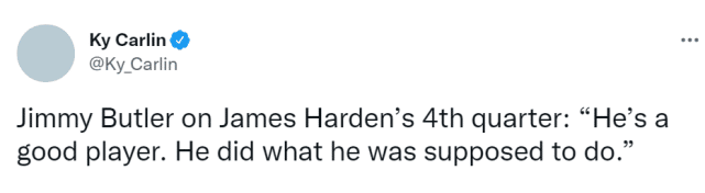 此前,《费城问询报》的专家Marcus Hayes 曾喊话费城主帅里弗斯,写道:“。”他对哈登的状态很不满,而哈登也用实际行动回应了Marcus Hayes的质疑,一场30+的全面表现,再加上一场扳平总比分的胜利,足够了。对手巴特勒也谈到了哈登的表现,巴特勒说道:“他是一个好球员,他做了他应该做到的事。”