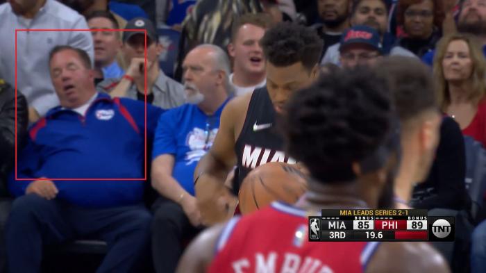 巴特勒第三节独砍17分大爆发,三节打完热火落后4分;值得一提的是,第三节镜头拍到一球迷坐在场边睡着了。
