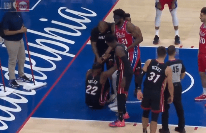 下半场,76人第三节开场领先到两位数,巴特勒带队反扑,恩比德再次得分,连续两次迎着阿德巴约中投得分,干拔2+1太不讲理,并且示意让阿德巴约坐回替补席,此时热巴身背4犯;打着打着恩比德防守时打到巴特勒的脑袋,吃到一级恶犯,之后友好拉起巴特勒。